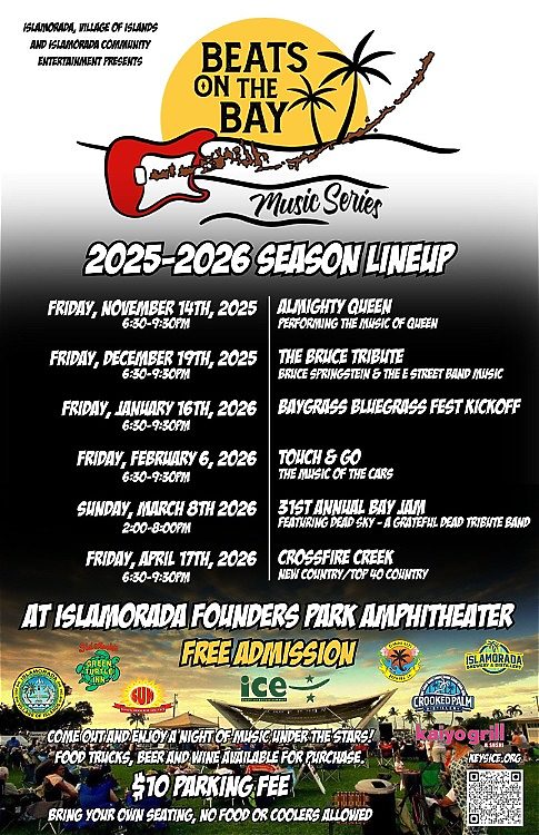 Looking for a great free outdoor music event in Islamorada then look no further than the Beats on the Bay music series held monthly at Islamorada Founders Park Amphitheater. April's series is Crossfire Creek. Admission to the event is free but there is a $10 parking fee. Be sure to bring your own seating but leave the food and coolers at home. Beer, wine and food for sale. Have a great time under the stars! Gates open at 5pm music 6:30-9:30pm