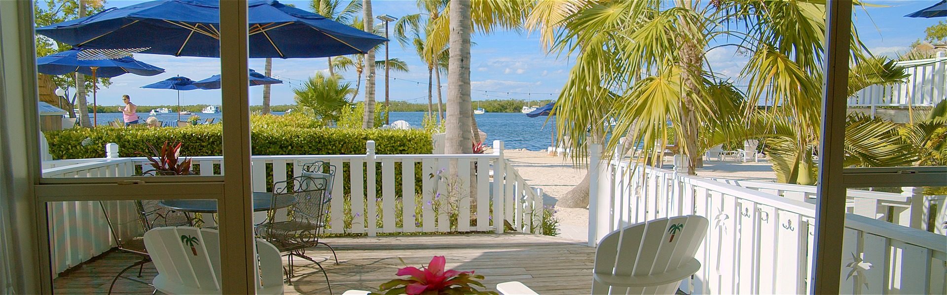 The ground floor 700 sq ft Thatch Palm Suite is a one bedroom King Suite that has a spacious separate master bedroom with a pillow-top King bed, large flat-screen TV and an ensuite bathroom with a jacuzzi tub, separate shower, area, large vanity and additional access to the living area. The living area has a large picture window with stunning views of the Florida Bay. A sleeper sofa, comfortable seating and a desk area are complemented by a large flat-screen TV and dining area for 2. The kitchen is complete with a refrigerator, cooktop, microwave and Keurig. The suite opens to a 360 sq ft large private deck overlooking the beach, heated pool and the Florida Bay where sunsets are easy to capture from the 2 Adirondack chairs or outdoor dining table with chairs and an umbrella. The private deck has steps leading directly to the beach.